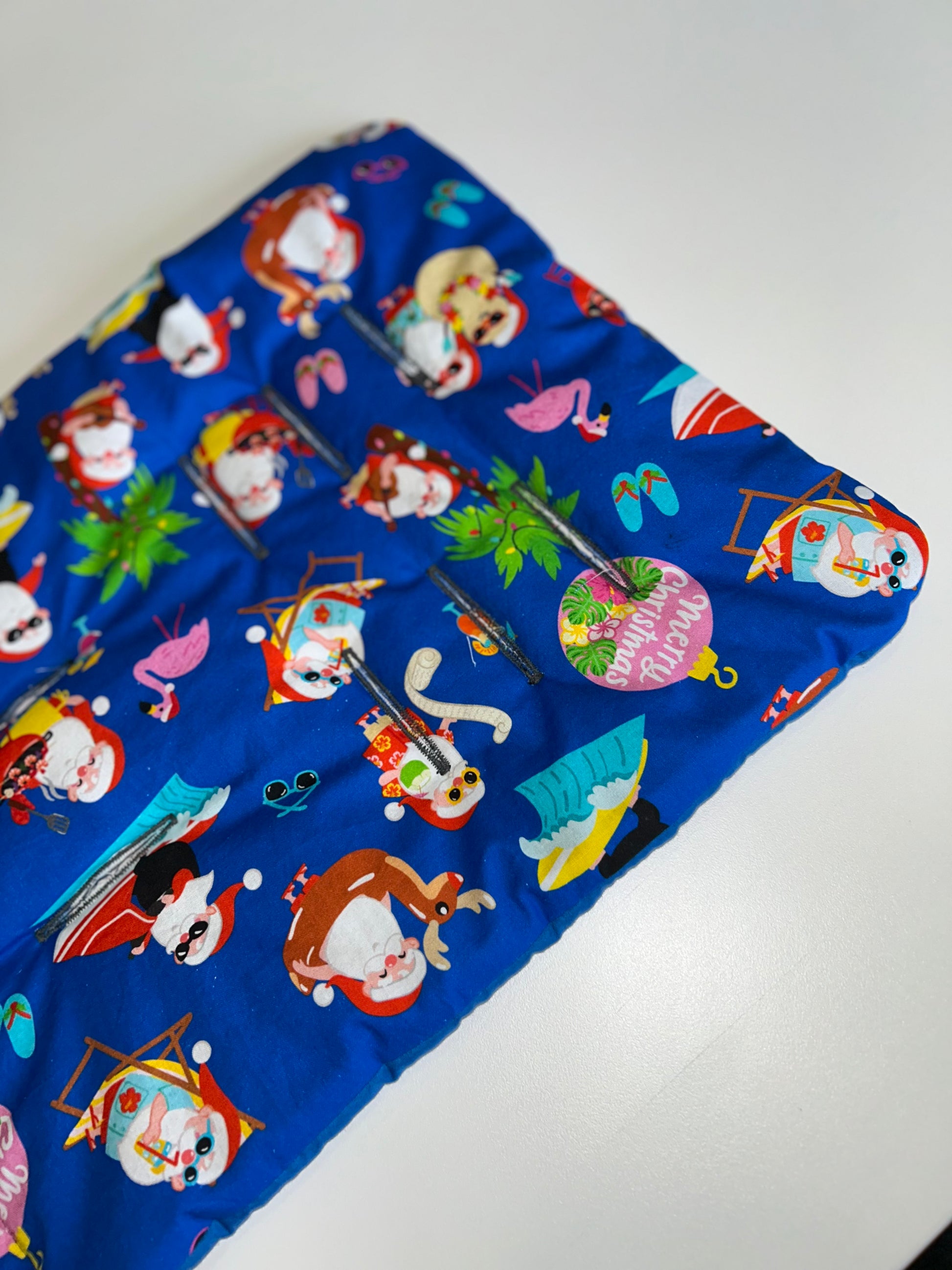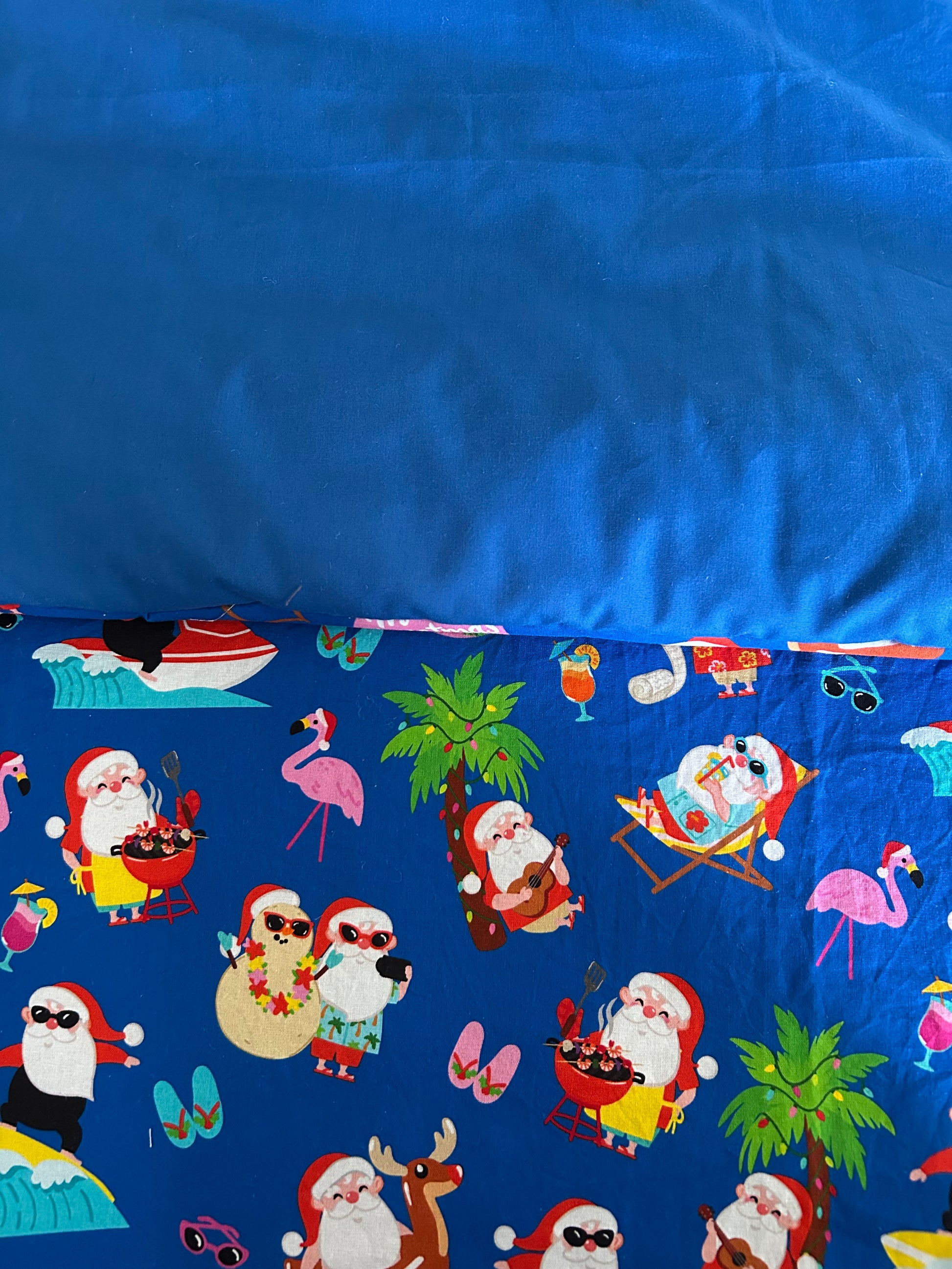 One side showcases the cheerful Santa’s Day Off print, made from 100% cotton fabric, offering a breathable and natural touch against your baby’s skin. The reverse side features smooth blue poplin 80% polyester, 20% cotton, chosen for durability and easy-care — perfect for everyday use during the festive season.